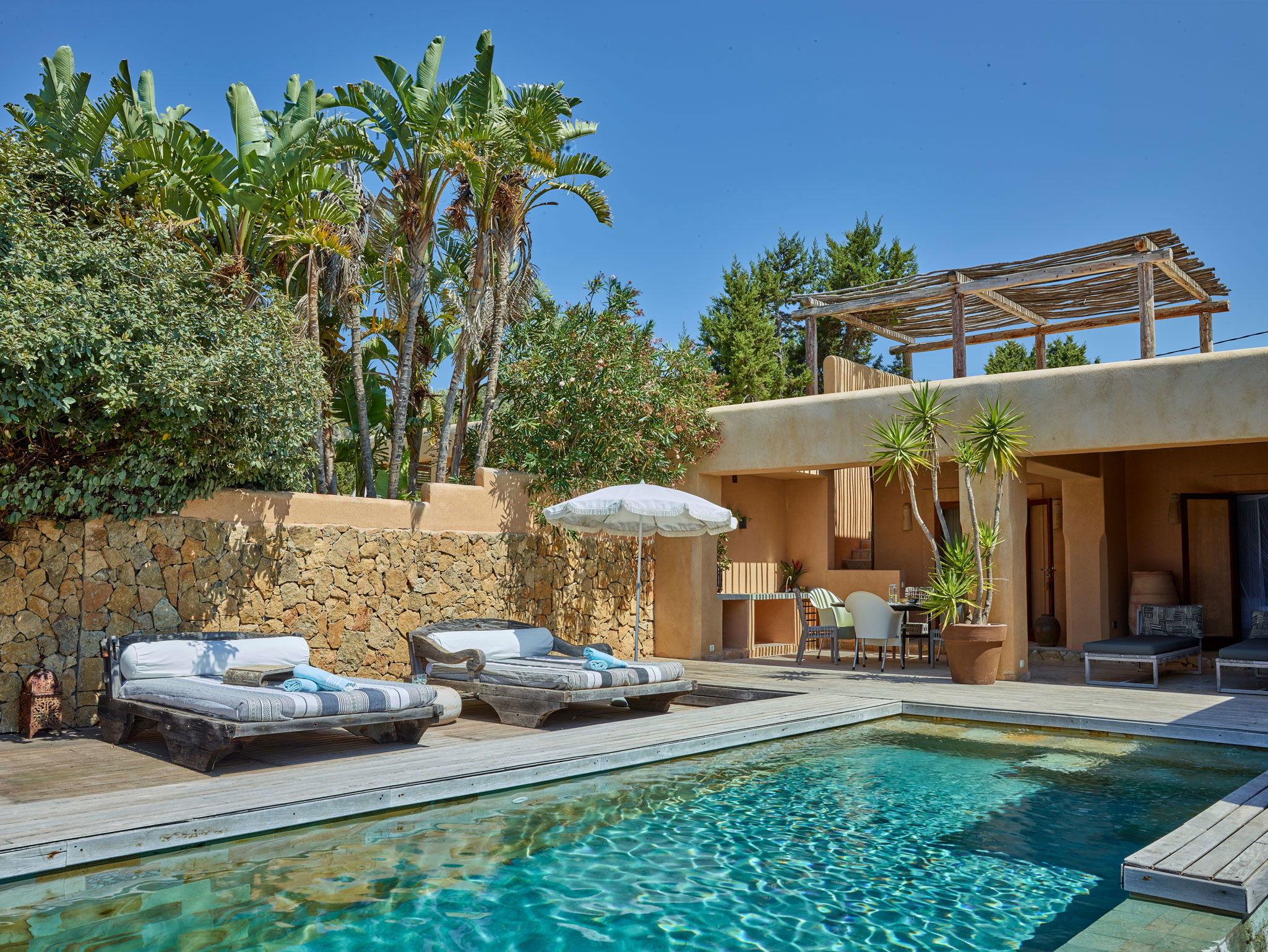 Como un oasis tranquilo en una isla famosa por su carácter cosmopolita, Kasbah 1 es una casa lujosamente encantadora en Ibiza para quienes buscan un sabor de la auténtica vida balear. Consta de dos habitaciones en la casa principal que se abren a terrazas sombreadas y una tercera habitación con baño en suite en la íntima casa de huéspedes del jardín. Relájate en los sofás, disfruta del sol, descansa en las terrazas y contempla las majestuosas vistas de Es Vedra; puedes sentir su energía mítica irradiando en todos los rincones de la casa.